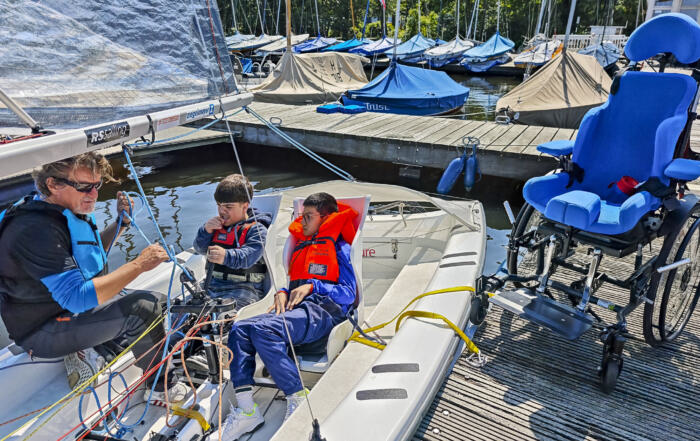 Mit diesen wirklich anspruchsvollen Bedingungen kam Johannes Bahnsen aus dem HSC – seines Zeichens Welt- und Deutscher Meister im E-sailing! – deutlich am besten zurecht und legte eine saubere 2-2-1-1-Serie hin. Und das, obwohl seine hierzulande völlig unbekannte „Phantom Classic“ – eine dieser zahlreichen, britischen Jollenklassen und eine Art Kreuzung aus Laser und Contender – in der letzten Wettfahrt anfing, mit Beschlägen um sich zu werfen. Aber Johannes kann es nicht nur mit dem Trackpad, sondern weiß sich auch an Bord im echten Leben zu helfen!