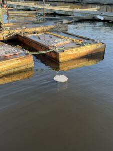 Die Pfähle des Mittelstegs wurden zurückgeschnitten. Heute geht es weiter mit der Montage der Pfahlklemmen, an deren oberen Ende eine tellerförmige Plattform zu erkennen ist, die sich gerade eben über dem Wasserspiegel befindet. Auf diesem Sockel wird dann später die Unterkonstruktion des neuen Stegs montiert.