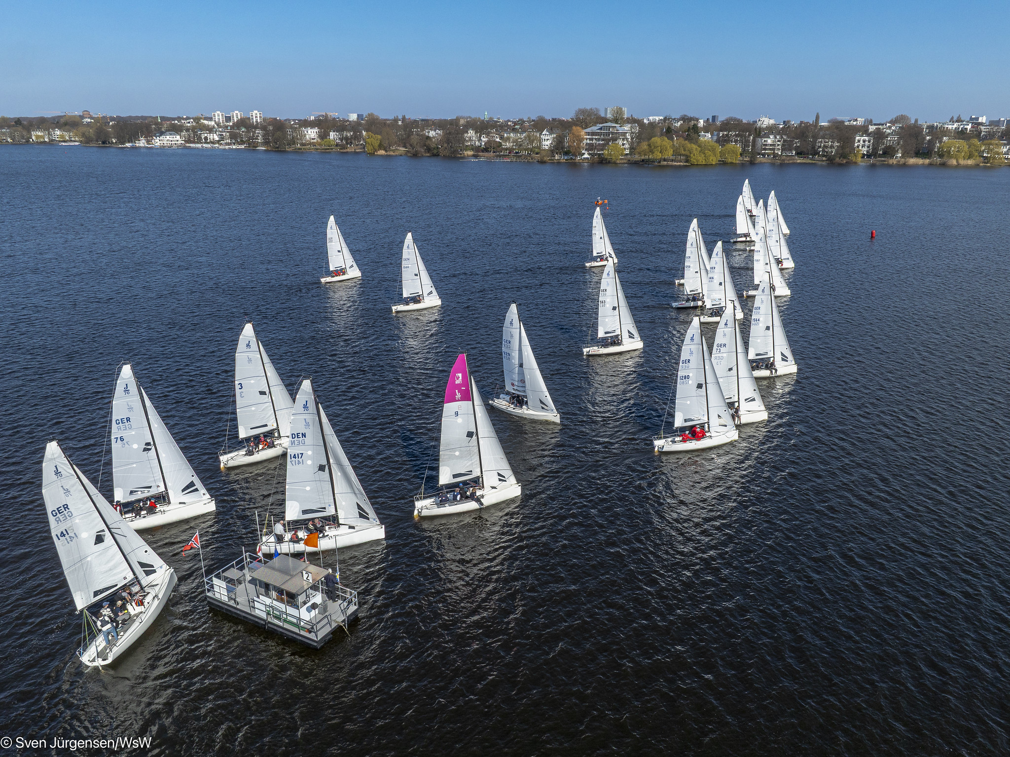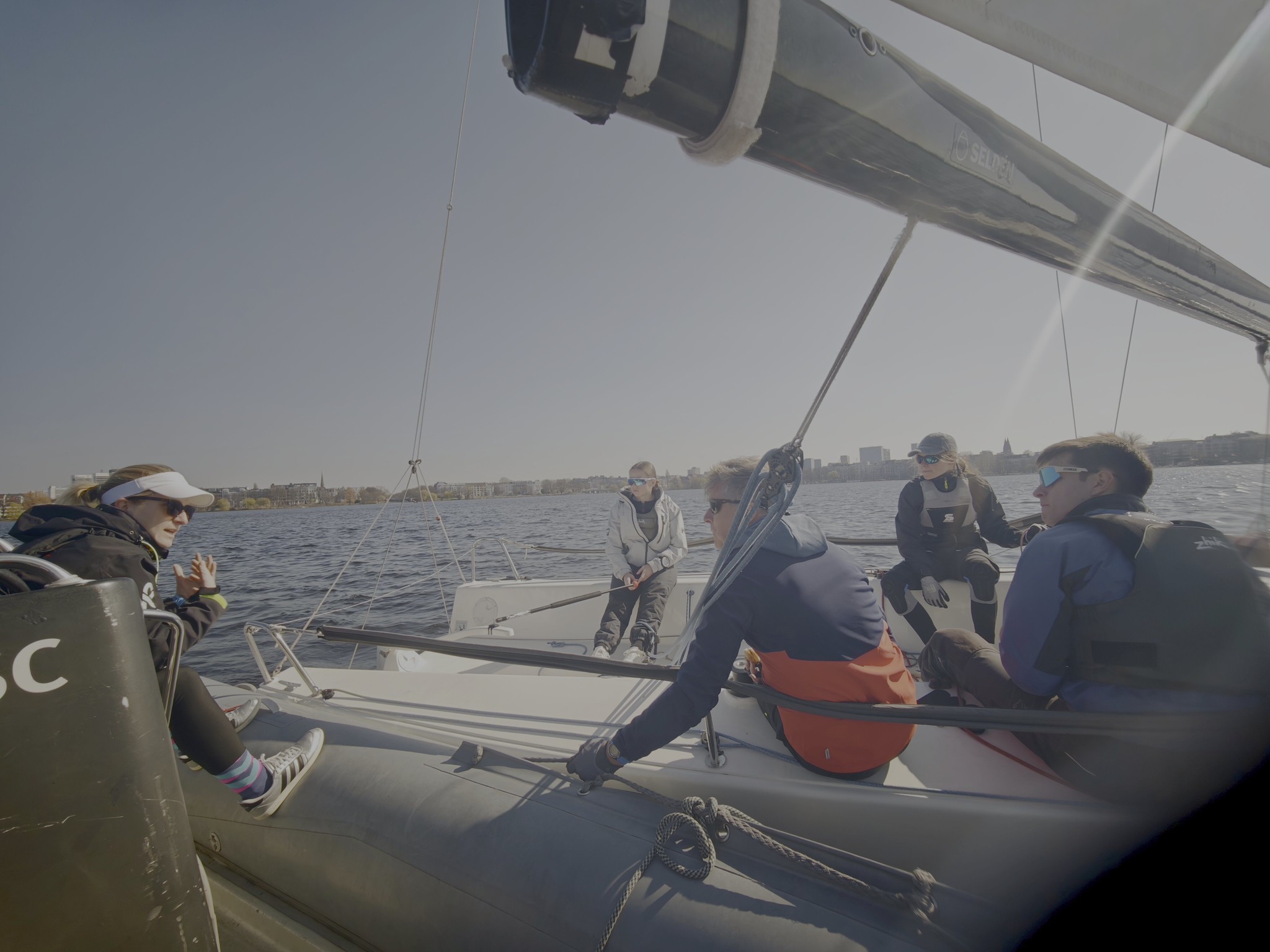Am Samstag begann der Regattatag mit dem gemeinsamen Aufbau der Boote. Anschließend fuhren beide Teams zum NRV, um an der Steuerleutebesprechung teilzunehmen. Anschließend ging es bei zunächst schwachem und stark drehendem Wind aufs Wasser. Die Bedingungen erwiesen sich als anspruchsvoll und wechselhaft – typisch für die Alster. Trotz dieser Herausforderungen konnten am ersten Tag insgesamt sieben Wettfahrten gesegelt werden.