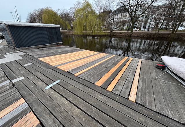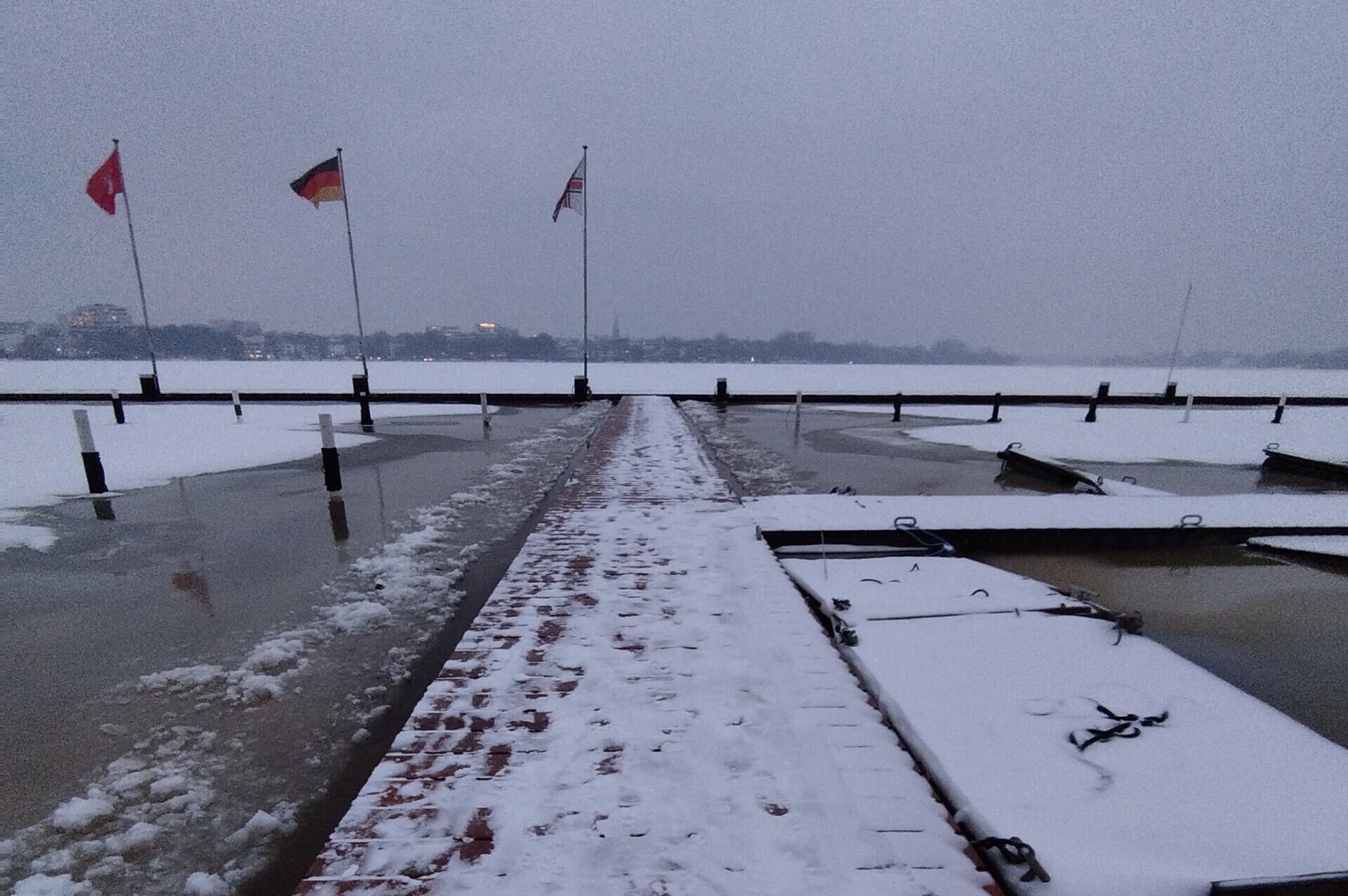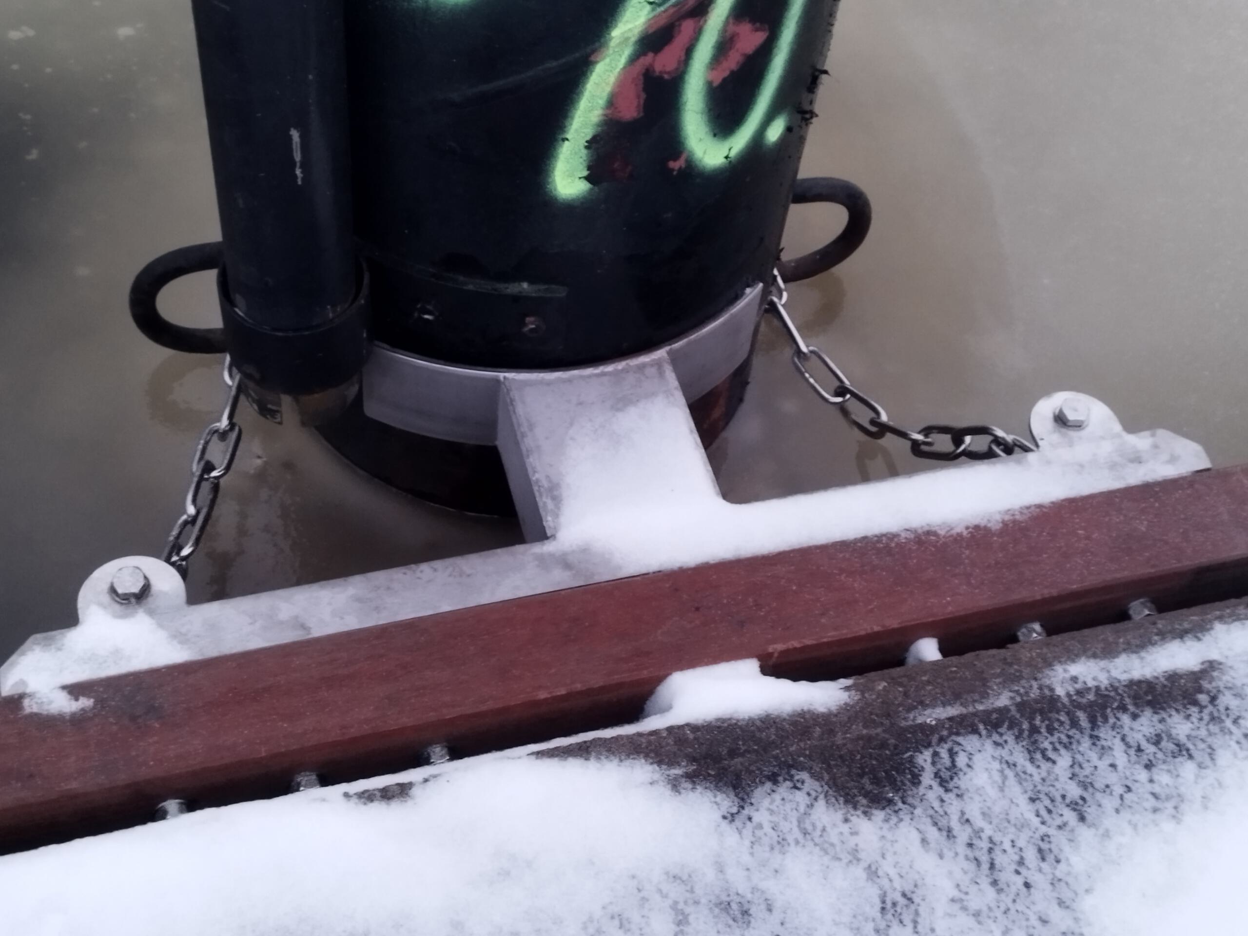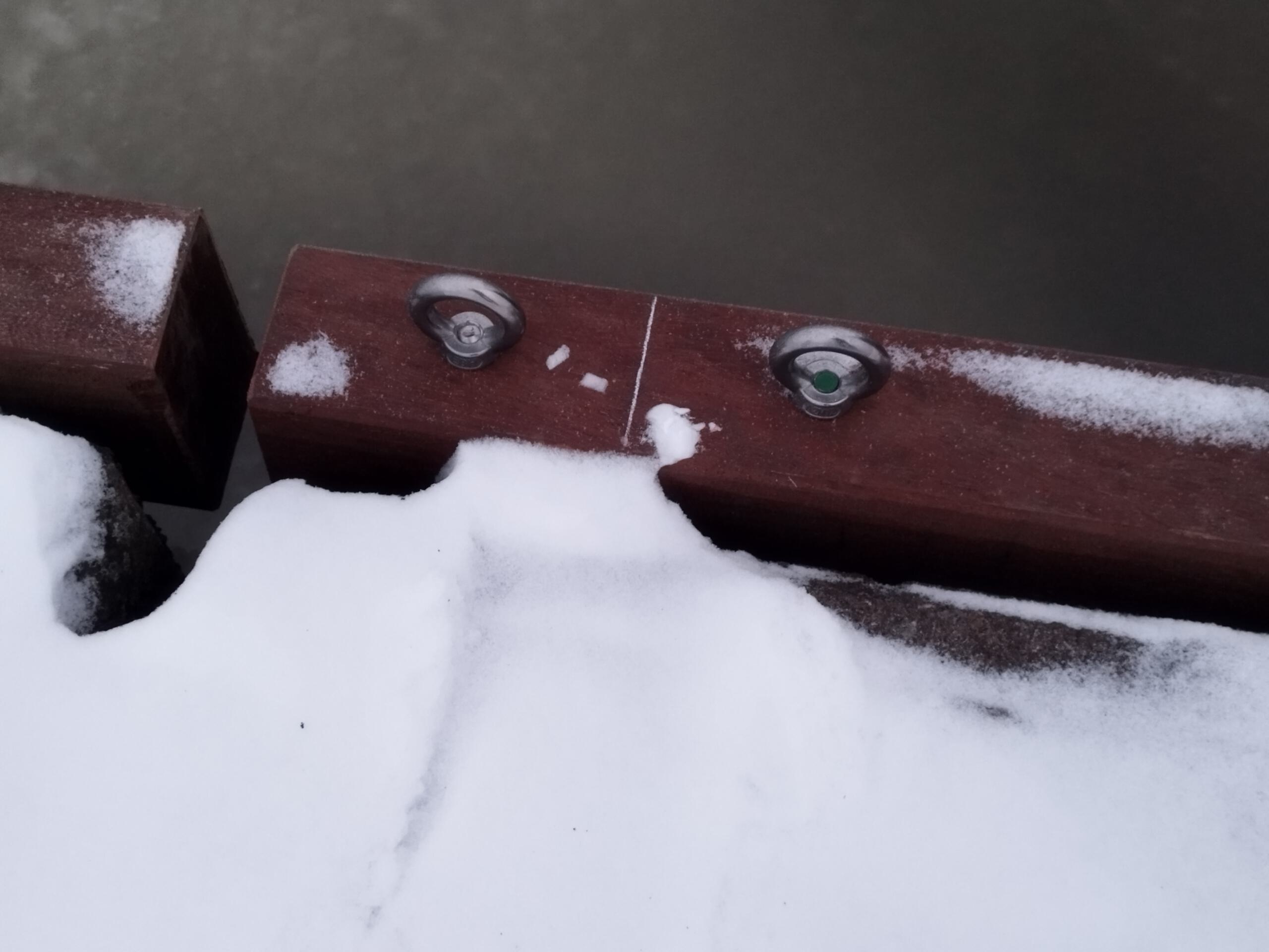 Leider bedeckt die weisse Pracht das schöne, neue Bongossi-Holz, das für die nächsten 50 Jahre gut sein sollte. Aber auch so macht die erste Begehung des Mittelstegs Freude. Toll auch die neuen Fenderhölzer nebst Pfahlschlössern und Festmacherösen am Betonsteg – aus VA, versteht sich. Die Peilung entlang der Stegkanten ergibt: alles schnurgrade und topfeben. Dass die Fenderhölzer nun aus Hartholz sind (vormals weiches Nadelholz) könnte allerdings die Ambitionen manch eines Alsterglocken-Teams etwas einbremsen……