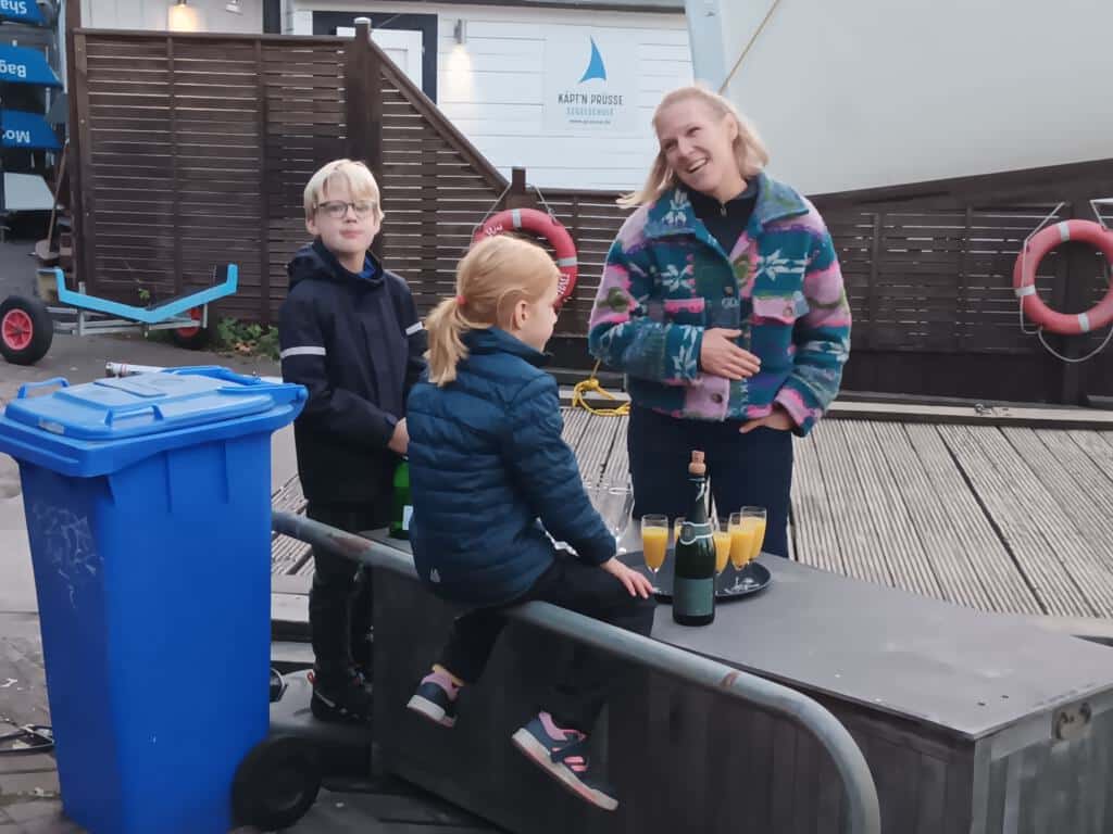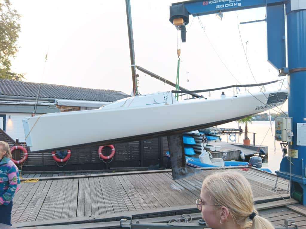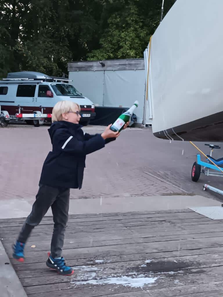 Die Taufansprache wurde von seiner Nachfolgerin Bernadette Zipfel – selbst Skipperin einer Club-J70 – gehalten. Für eine standesgemäße Sektdusche, die Verkündung des neuen Namens „Jubiluv“ und den klassischen Spruch mit der Handbreit Wasser unter dem Kiel sorgte ihr jüngster Sohn (8) – gut gemacht, Emil!